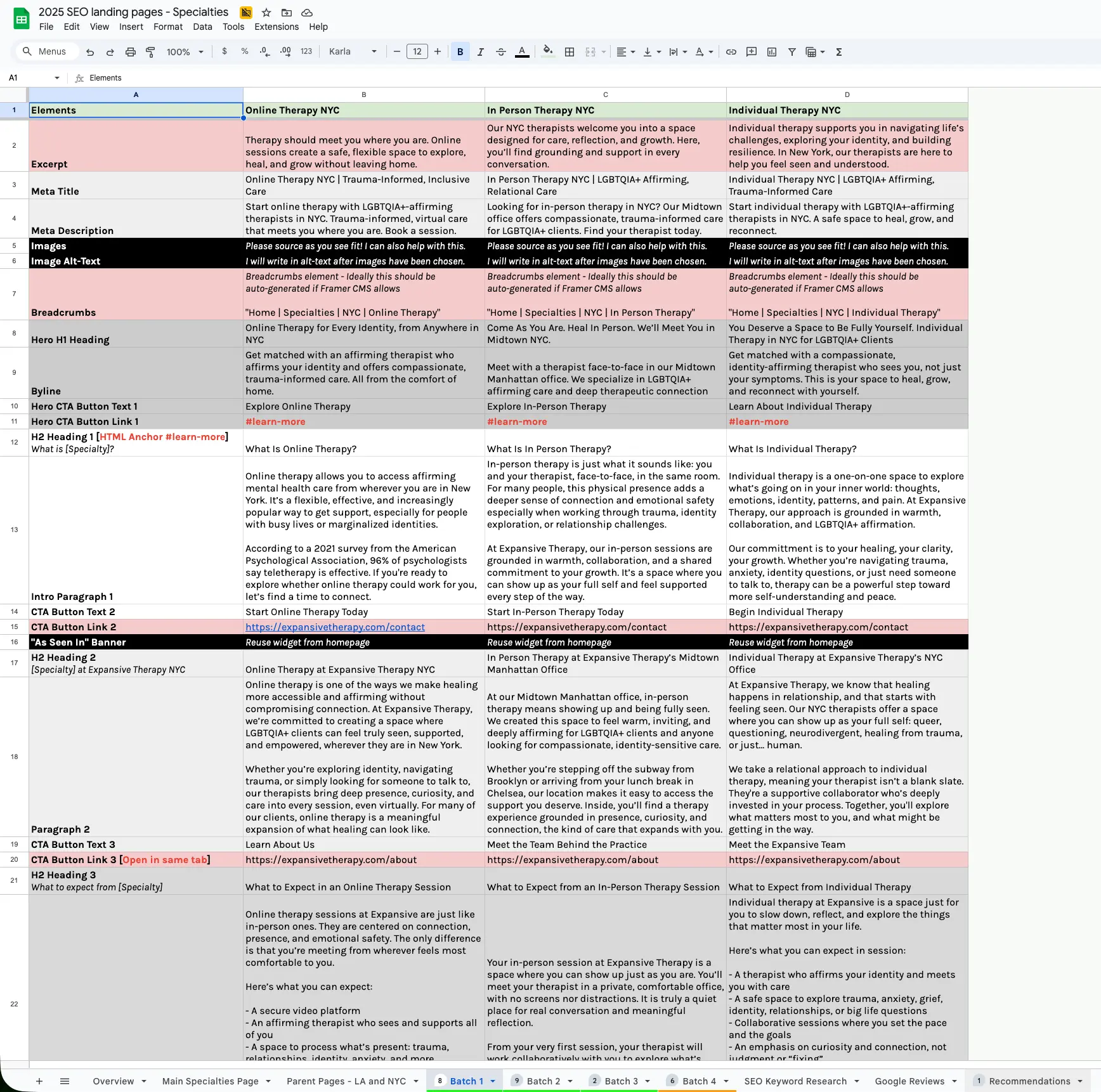 This project focused on designing and implementing that system. In collaboration with the Expansive Therapy team, I led the development of a full specialties architecture: a 37-page SEO framework built around service and location targeting, with dedicated pages for each offering across NYC and LA. I wanted to ensure every page was unique, clinically accurate, affirming, and strategically positioned to rank without competing against itself.